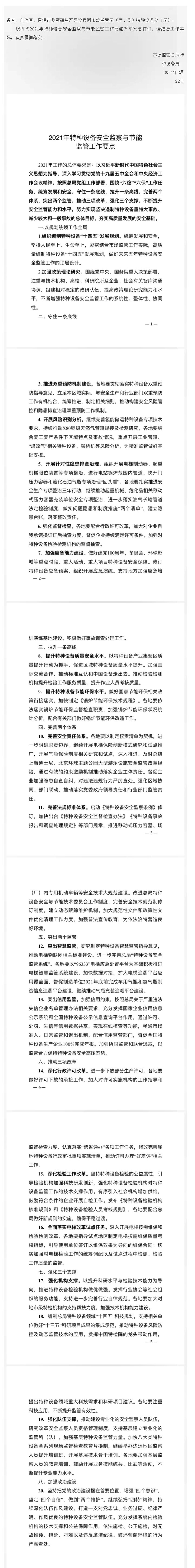 市场监管总局特种设备局关于印发《2021年 特种设备安全监察与节能监管工作要点》的 通知(市监特设(司)函〔2021〕5号)